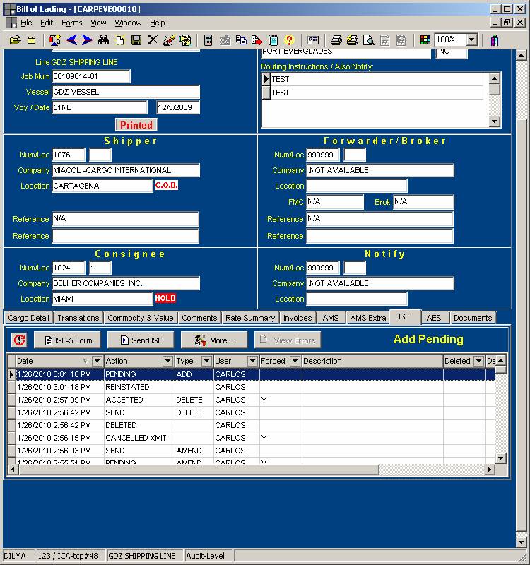 Once the ISF has been entered, it can be sent to Customs by pressing the Send ISF button in the B/L itself or the AMS module. Its status will change form Pending to SEND. When the poller picks up this information and sends it to customs, it will change to SENT. The Status can be verified in a better way from the AMS module