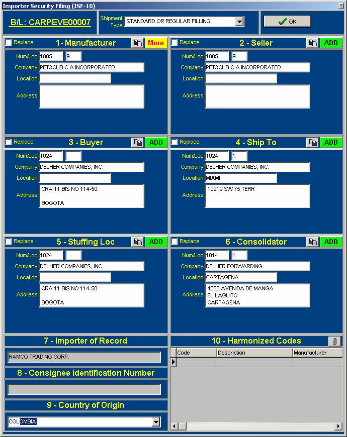 It shows the Shipment Type, which will be selected from a drop-down list, depending on the case. Additional names, such as Manufacturer, Seller, Buyer, Ship to, Stuffing Location, and Consolidator, need to be provided in this file; these names as mentioned before, behave the same way as a CMS component with all its properties, such as Replacements. Also multiple parties can be added if needed, by clicking on the Add or More buttons. There are some other fields that are grayed out, meaning that this information is already assigned from the bill of lading. Country of origin needs to be pulled up from the drop-down list. It is important to assign the Schedule B number in the B/L , so that the information be already assigned in the ISF Form
