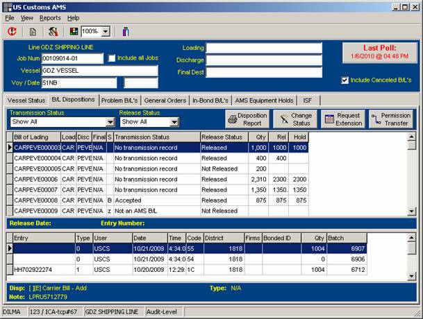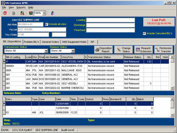 Users can get more detailed information about the status of the bills of lading by going into the B/L dispositions Tab