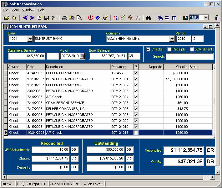 For further reviewing, the user may also go to the document being reconciled by hitting <Enter> or double clicking on a highlighted line item. A check may also be voided from this program. Afterwards, the program will show the current status under the status column.