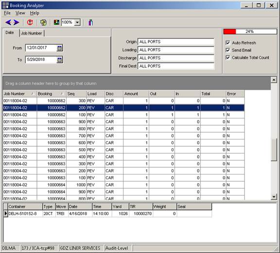 The booking analyzer program allows to have a general view of the movement of bookings either in a peri9od of time of per job number. It shows job number, ports, booking number, equipment type being booked and whether the container is out at a customer or full in the yard, This information can be refreshed as often as the user wants by defining the refresh interval (view\Set interval)