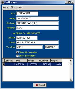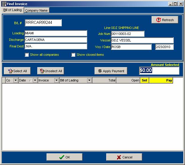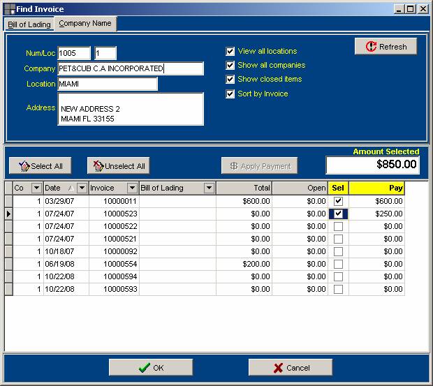 If the user entering the cash receipt does not remember the invoice number but has the Bill of Lading number, there is an additional window that will help find the invoice, as shown in the next figures. It can be found by company, by entering the number or the name of the company. You may select all locations, all accounting companies and closed items