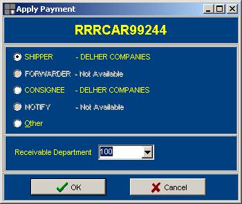 The program will ask to select a specific customer from a list and the receivable department. All this information is required, since an accounts receivable will be created. Once you click Ok, you can apply the amount that is being received. At this point, the cash receipt will have a line item with bill of lading number and the invoice number attached to it.