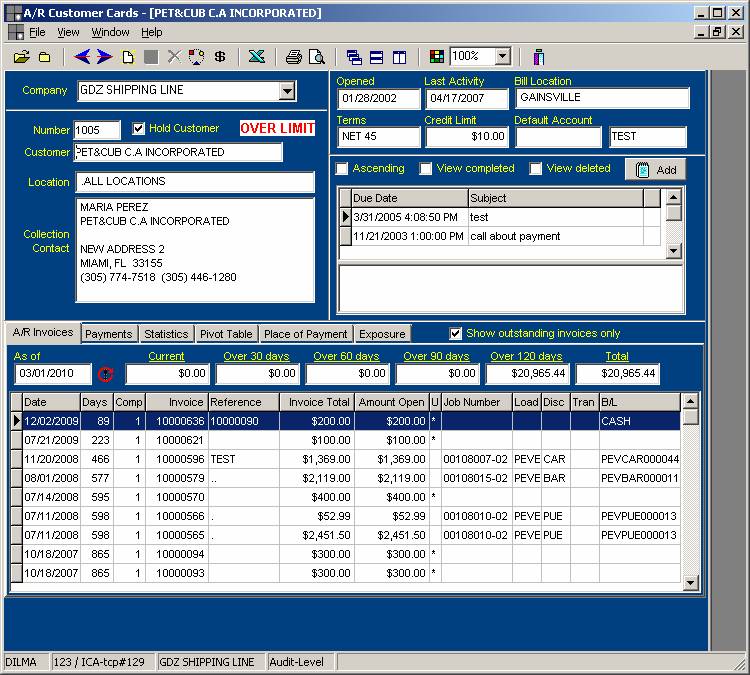 The customer card displays in the lower section, an on-line aging, since the invoice tab is selected by default, based on the current date. It shows the invoice number, the date, the amount, job number, ports and bill of lading number. If the date needs to be changed, you can do so by clicking in the field. It is very important to click on the Refresh button to bring forth the most current information. Other criteria that can be selected is the Show outstanding invoices only, as well as the aging periods, they can be modified and depending on this, the list of invoices will be different.