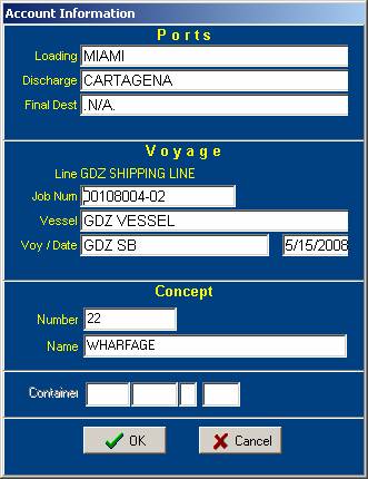 A screen like the following one will appear when using an account with subsidiaries in the detail of an invoice or in a journal entry. The ports, the job number and the concept information have to be entered. Then the program will assign the correspondent department and the user may change it if needed.