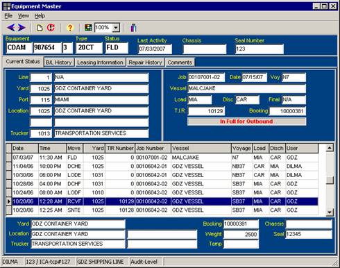 3. The third section contains the history of the container. It displays the sequence of all movements, with the date, the container yard the TIR number, the job/voyage information and ports. As the movement is highlighted, additional information gets displayed in the lower screen, pertaining to that movement. The TIR can be accessed by hitting enter or double-clicking on the line item.