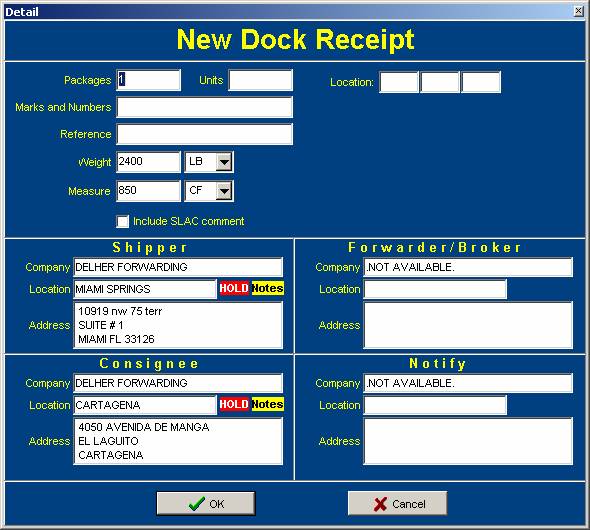 To create a northbound dock receipt, just hit Enter or double-click on the highlighted line item; you will get the following screen