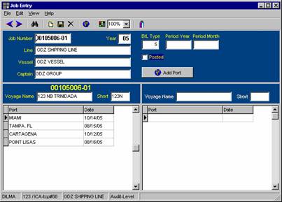 1. General information: contains the basic information about the line, vessel, captain, year and the job number. The Bill of lading numbering type is defined at this point, and it is customer specific, or 0 (zero) if manual numbering. There is a new feature: the period year and period month fields. This means that the Bills of lading will be posted on the period that is defined on this screen. It has an additional field called Posted. When this field has a check mark, it means that all the B/L’s for this job have been posted and have accounting information. If a correction takes place, there will be an additional note in the invoices, stating such correction. It has an alternate sequence option, in case the user needs the job to have a different sequence than the regular one. At the end there is a field to add a port, if needed.