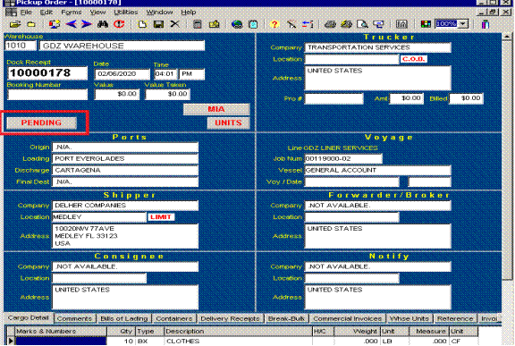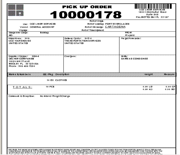 A Pickup order is a document that is used to go and pick up some cargo at the customer’s location and bring it into the warehouse. It is like a temporary pre-created dock receipt in which the pieces are not part of inventory until it arrives in the warehouse