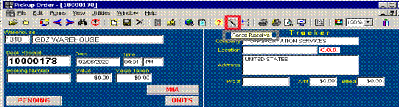 Once the cargo physically arrives in the warehouse, the pick up order gets converted into a dock receipt by pressing the button force receive.