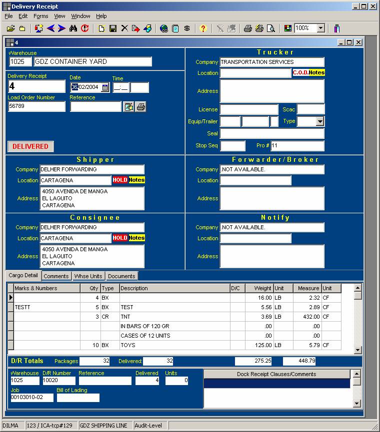 detail, which in the bottom shows, dock receipt being delivered, number of