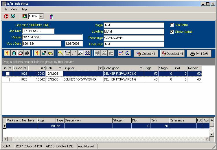 The Dock Receipt by Job number is a view of the list of all dock receipts that have been entered under the selected job number and ports combination. Once this criterion is entered, a list will be displayed in the screen, with the dock receipt number, the warehouse number, Shipper, Consignee and pieces and their status detailed in the document. An option to view the dock receipt detail may be selected, which will open an additional section at the bottom