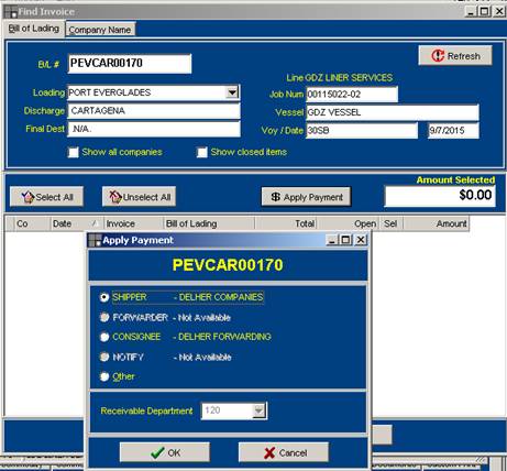 2. There is no invoice but there is a B/L:. Hit enter on the invoice field an additional entry will open, where the B/L number can be assigned. Click on the Apply payment and this process will create an invoice for this B/L with the customer selected in this screen