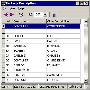 This support file displays the list of all types of packages that are used in the ISIS traffic programs, such as dock receipts, bookings and Bills of lading, to identify the type of cargo that is being handled It shows the abbreviation of the package, the description and an additional field that can be used for translation purposes